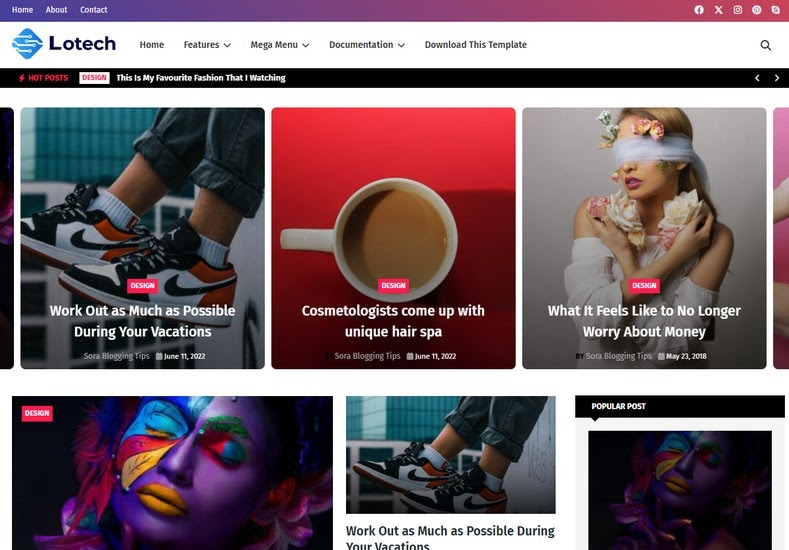Lara Blogger 模板是一个时尚且有吸引力的极简主义博客主题。它专为生活方式杂志、时尚杂志、在线新闻、健康和美容技巧、创意设计、网页设计和健康技巧博客而设计。为了方便您,我们发布了这份详细的文档,以便您可以正确设置您的博客。选择我们的模板,您做出了明智的决定。 您可以查看现场演示或通过下面的按钮下载模板,还请仔细阅读本文档以设置您的博客,请注意,不支持免费用户。 顶部导航/页脚菜单 访问您的博客 布局 > 单击 编辑图标 在 顶部导航 小部件。 社交热门 访问您的博客 布局 > 单击 编辑图标 在