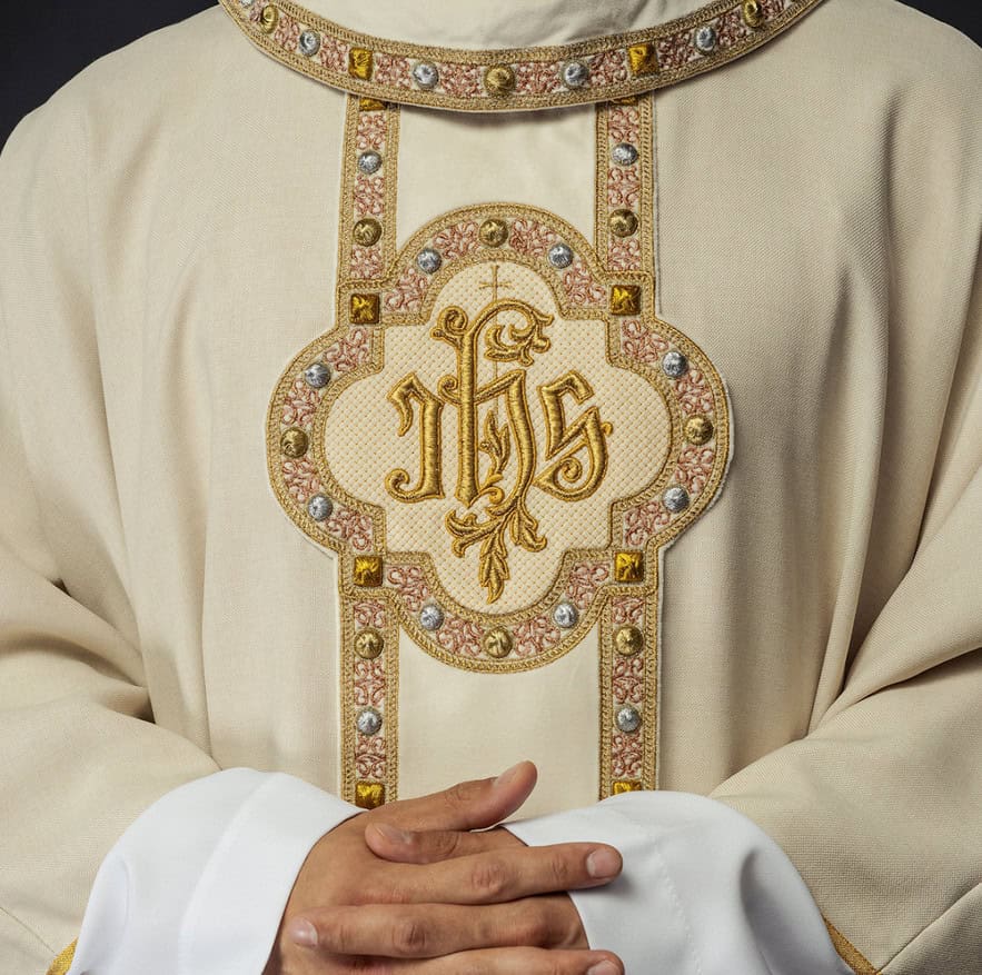 礼仪服装具有丰富的色彩和装饰,不仅仅是服装。它们是一种讲述信仰、传统和象征意义的视觉语言。了解这些法衣的设计意味着进入一个意义深远的世界,能够丰富我们的精神体验和庆祝活动的参与。 颜色是礼仪服装中最明显和最重要的元素之一。每种颜色都与礼拜年的特定时期或特定的庆祝活动相关,表达了基督教信仰的不同方面: 白色的: 白色象征着纯洁、欢乐和荣耀,在复活节、圣诞节、主的节日(受难节除外)、圣母玛利亚、天使和非殉道圣人的节日期间使用白色。 红色的: 代表鲜血、激情、神圣之爱和殉难。在棕枝主日、耶稣受难日、五旬节、使徒节和殉道圣人节期间穿红色。 绿色的: 象征希望和永生。绿色是平常时期的颜色,是礼仪年中我们默想基督的一生并等待他再来的时期。 紫色: 表示苦行、等待和准备。紫罗兰色用于降临节和四旬斋期间。 黑色的: 传统上与哀悼和纪念死者有关,在安魂弥撒中可以使用黑色。 玫瑰: 玫瑰色是一种不太常见的颜色,它象征着喜悦和减轻的希望。它可以在降临节第三个星期日(Gaudete)和四旬斋第四个星期日(Laetare)使用。 装饰设计:信仰的字母表 除了颜色之外,礼仪服装还经常装饰有各种装饰图案,每种图案都有其特定的含义。这些设计可以刺绣、编织或绘画在服装上,将其转变为讲述圣经故事、表达神学概念和庆祝圣洁的艺术品。 基督论符号 基督论的象征是那些直接指耶稣基督的象征: 上帝的羔羊(Agnus Dei):