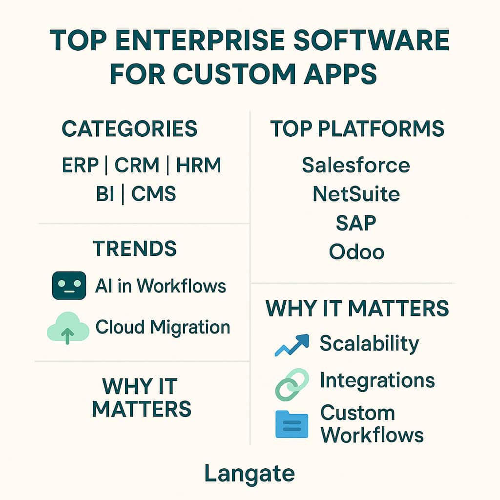 企业软件是现代商业的支柱,Salesforce、NetSuite 和 SAP 等工具可帮助公司管理从财务到客户关系的一切事务。当这些平台经过定制以适应独特的工作流程时,真正的力量就会显现出来。 在 兰盖特,我们已经看到了正确的企业堆栈如何将复杂的操作转变为流畅、可扩展的系统。本文详细介绍了顶级平台和趋势,为您提供了为自定义应用程序开发选择正确基础的分步指南。 企业软件的定义是什么? 人力资源、薪资、营销和工作流程的自动化 企业软件是为了规模而构建的。这些不是您为任务列表下载的小应用程序 – 它们是保持整个部门运行的系统。人力资源系统处理工资、入职和时间跟踪。营销工具自动化营销活动和报告。工作流程和项目管理工具使团队保持同步。重点是:它们减少了体力劳动,因此人们可以专注于更高价值的任务。 企业平台类别 企业应用涵盖范围广泛。有些名字你会经常听到: ERP(企业资源计划):整合财务、供应链和人力资源。 CRM(客户关系管理):集中销售和客户互动。 HRM(人力资源管理):工资、福利、招聘。 BI(商业智能):用于决策的仪表板和分析。 CMS(内容管理系统):管理网站和数字内容。 这些类别重叠,但它们一起创建了自定义应用程序的支柱。 为什么选择企业平台来定制应用程序?